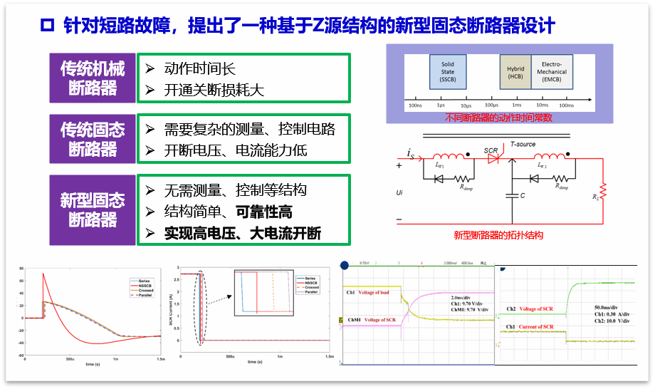 王雨峰的论文中,为了解决传统机械式直流断路器熄弧难,以及传统Z源断路器电源负载不共地、负载变化易误触发等问题,提出了一种新型直流固态断路器。不同于传统的Z源直流固态断路器,在该新型单向直流固态断路器中用变压器绕组来代替Z源断路器中的LC支路,通过变压器原、副边绕组的互感来产生反向电流进而关断晶闸管,并且变压器匝数比可调,通过调整匝数比可以很好的消除负载突变对电路的影响。制作了原理样机并进行了相关的实验。相关结果如下图所示。