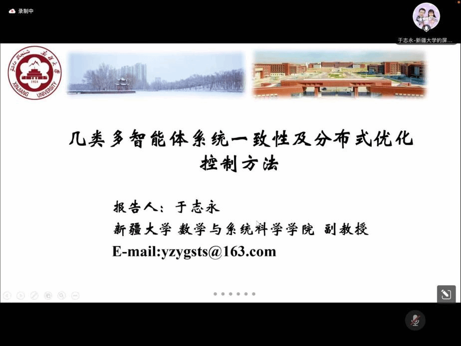 来自西北地区七位知名学者和企业专家做论坛专题报告,介绍了信息物理系统领域目前最新研究进展及需要解决的问题。西北工业大学的王震教授做了题为“AI驱动的网络空间智能对抗”的学术报告,西北工业大学的李慧平教授做了题为“海洋航行器模型预测控制”的学术报告,西安电子科技大学的郑元世教授做了题为“基于博弈的多智能体系统协同控制”的学术报告,国网青海省电力公司清洁能源发展研究院新能源产业发展研究中心的杨立滨副主任做了题为“基于电池储能的新能源送端电网暂态能量控制及储能优化方法研究”的学术报告,西安交通大学的张萌副教授做了题为“基于多智能体深度确定性策略梯度的非线性电力系统频率控制”的学术报告,国网陕西省电力有限公司电力科学研究院电源技术中心的王若谷副主任做了题为“含高比例新能源的电力系统优化运行与控制技术研究”的学术报告,新疆大学的于志永副教授做了题为“几类多智能体系统一致性及分布式优化控制方法”的学术报告。
