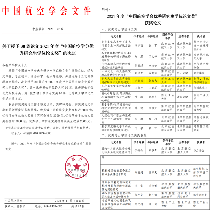 据了解,中国航空学会优秀学位论文奖旨在推动中国航空科技进步,鼓励创新性研究,促进青年人才成长。2021年度共评选出10篇优秀博士学位论文奖、5篇优秀博士学位论文提名奖。获得优秀博士学位论文奖的余自权曾获西北工业大学优秀博士毕业生、工信部创新奖学金二等奖等学术奖励。基于其博士论文研究工作、目前以第一作者身份在IEEE Transactions on Neural Networks and Learning Systems、IEEE Transactions on Control Systems Technology等期刊、会议发表学术论文30余篇,其中SCI论文近20篇,EI论文10余篇。主持国家自然科学基金青年基金1项、江苏省自然科学基金青年基金1项、中国博士后特别资助项目1项(站前)、中国博士后面上项目1项、中央高校基本科研业务费2项。