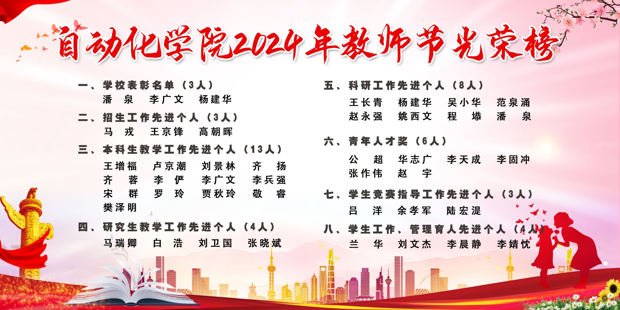 202 4 年教师节表彰决定。 本次大会共表彰41 名优秀教师,涵盖了招生 工作 、本科生培养、研究生培养、科研 工作 、 青年人才、 学生竞赛指导、学生工作 、 管理育人 等人才培养全过程。