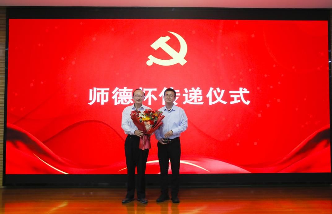 邀请了老一辈优秀教师代表刘卫国教授为青年教师代表赵世杰传递“师德杯”。