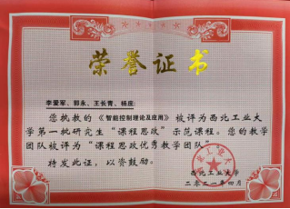 青衿之志,履践致远。李爱军老师在二十余年的教学过程中,从规范到创新、从经验到特色,收获了颇丰的教学成果,形成了一套“服务教学、植根科研、教研相长”的教学方式和育人理念。特别是在课程思政方面,他与时俱进,以科学思辨光芒为引领、以服务国家战略为使命,收获了师生们一众好评。以获得2021年西北工业大学第一批研究生课程思政示范课程《智能控制理论及应用》为例,李爱军老师采用理论教学结合案例教学的方法和“以学生为中心,科研服务于教学”的理念,并以课程为载体实现思想政治教育的协同,再具体结合到研究生接受教育的新时代、新主题、新担当,让立德树人教育达到“随风潜入夜,润物细无声”的效果。
