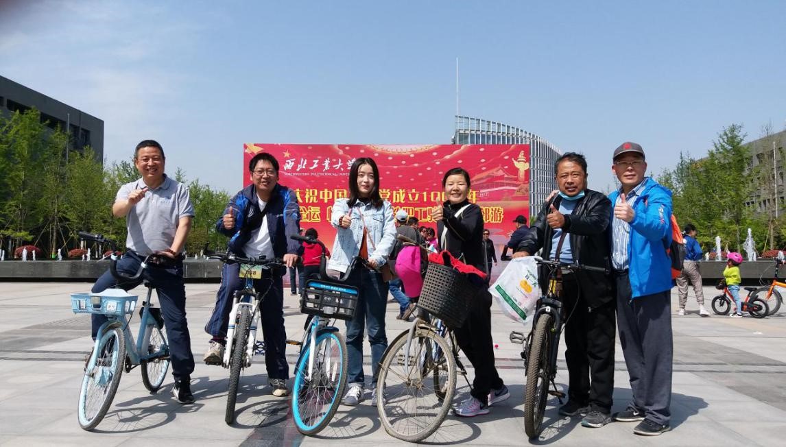 教职工参加庆祝中国共产党成立100周年骑自行车郊游活动。