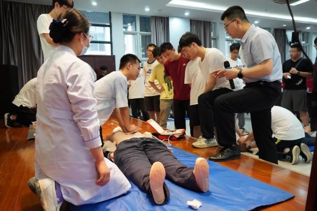 何凯亮为师生做急救知识与技能培训。他就心肺复苏术、AED的使用、常见急症的处理三方面进行了详细讲解。在讲座过程中,何凯亮现场开展急救技能实践培训,让同学们分为3组轮流学习心肺复苏术、AED的使用、海姆立克法等急救常识。通过何院长的生动讲课和现场热情互动,同学们不仅了解了应急救护的相关知识,初步掌握了自救互救的技能,还更加深入地认识到生命安全的重要性。