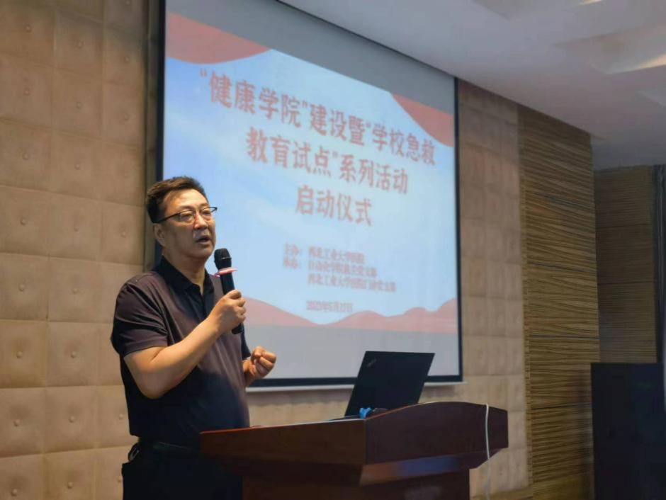 乔辉致辞并宣布活动正式启动。他围绕校医院的分布、规模、性质和医保等方面进行简单介绍,并肯定了医护人员在服务保障工作中付出的艰辛和努力。他强调,加强校园急救管理,一是要开设校园健康课程,提升学生健康素养;二是要增加急救意识培训,提升全民安全意识,积极营造“人人学急救、急救为人人”的良好氛围。