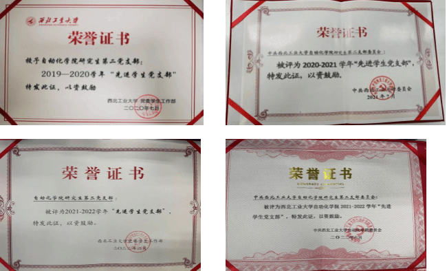 在指导教师、支部委员会以及支部成员的共同努力下,研究生第二党支部连续四年获校级“先进学生党支部”(2020-2023年),2020年、2021年、2022年连续三年获 “三创三力”样板学生党支部(全校仅10个学生支部获评),2022年度博彩网站导航