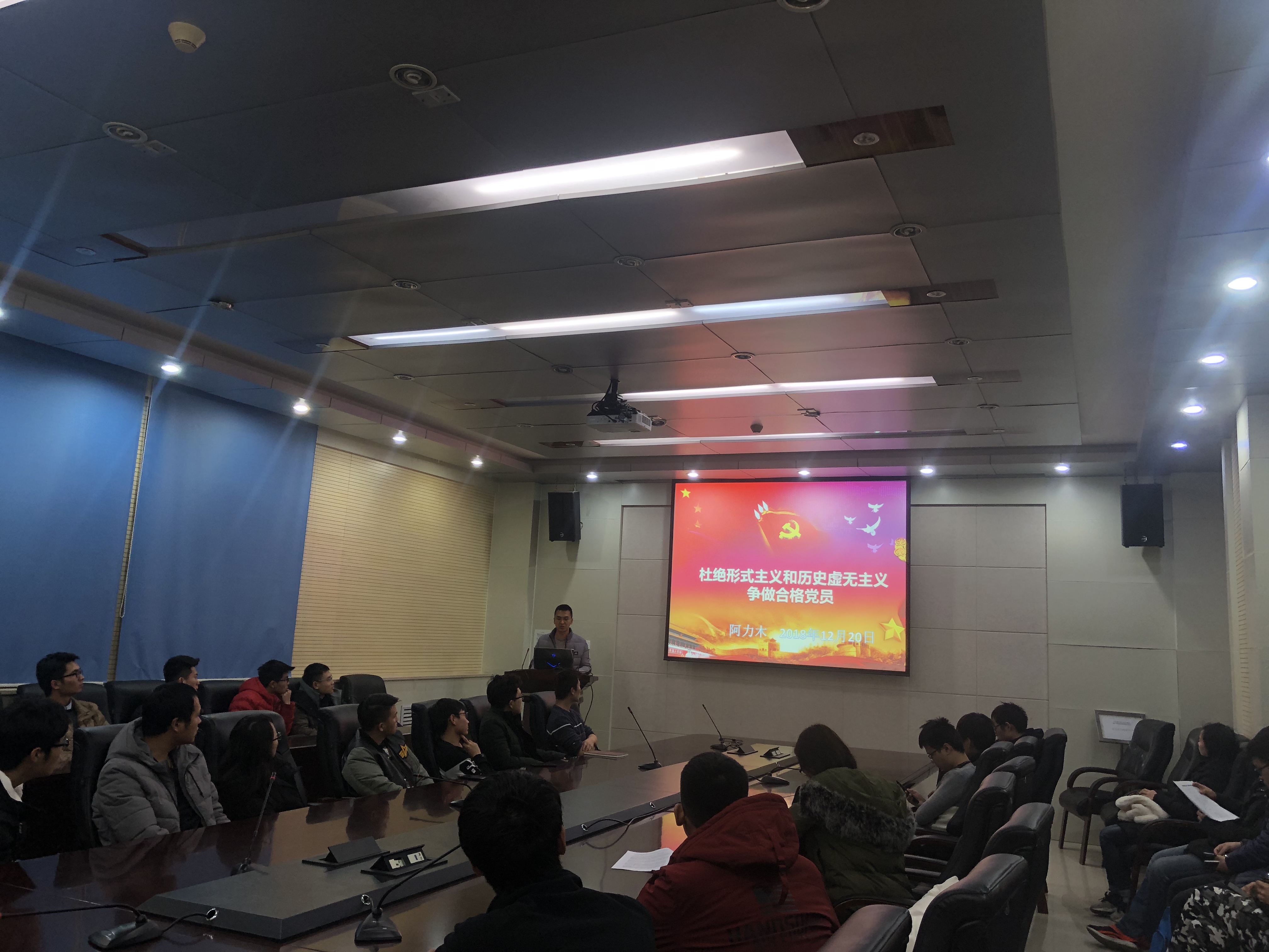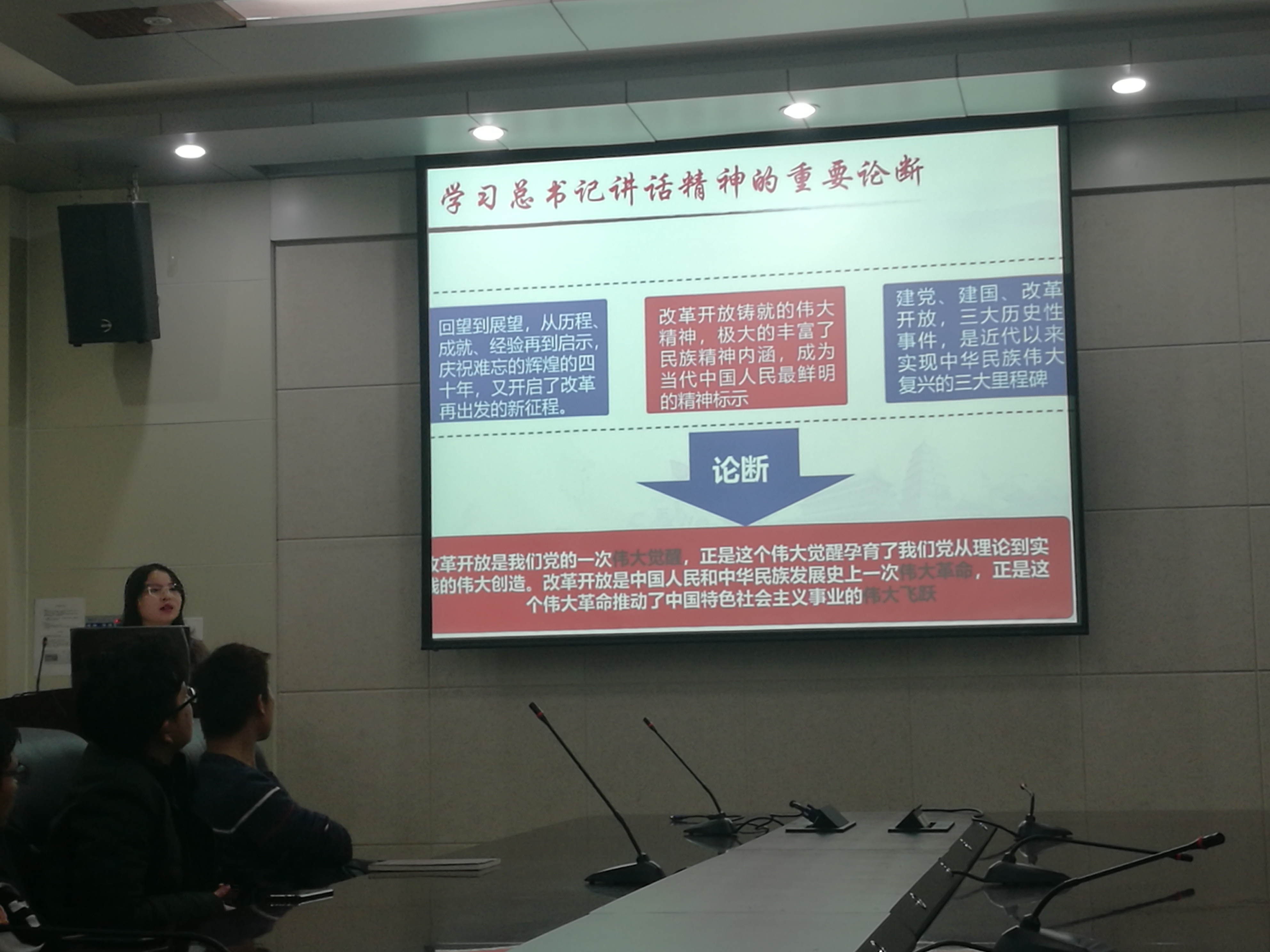 341会议室举行了交流分享活动。本次交流分享活动以“微党课”的形式举行,主要学习讨论“习近平总书记在庆祝改革开放40周年大会上的重要讲话精神”、“杜绝形式主义、抵制历史虚无主义、反思大学生党员的不良现象和网络上的不良思潮”等内容。本次大会由研习社社长阿力木同学主持。