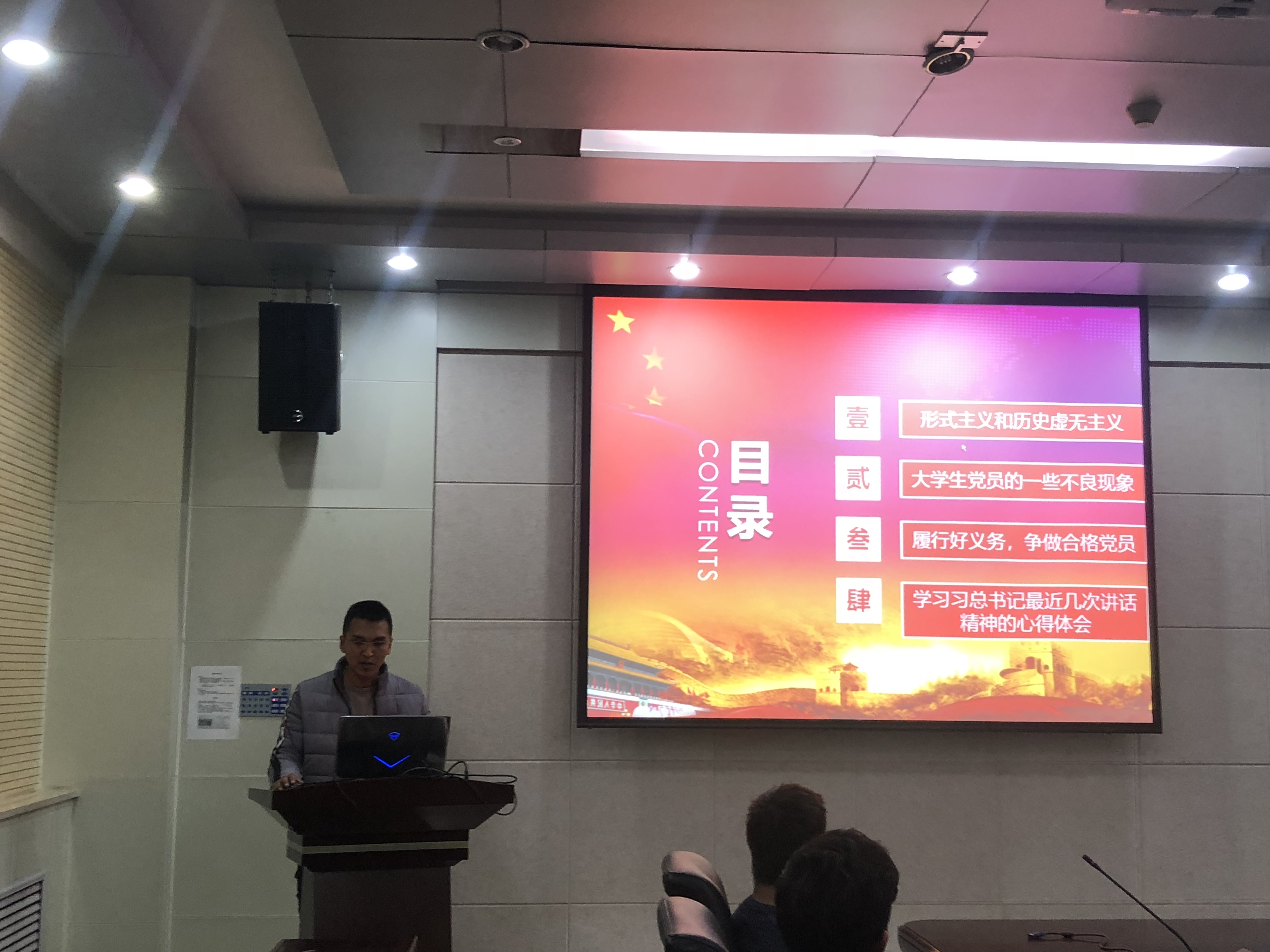 之后,阿力木同学从“杜绝形式主义和抵制历史虚无主义”、“形式主义和历史虚无主义给大学生党员带来的危害”、“履行好党员义务,争做合格党员”三个方面具体展开了他的分享。阿力木同学还分享了自己学习习近平总书记最近几次重要讲话精神的心得体会。