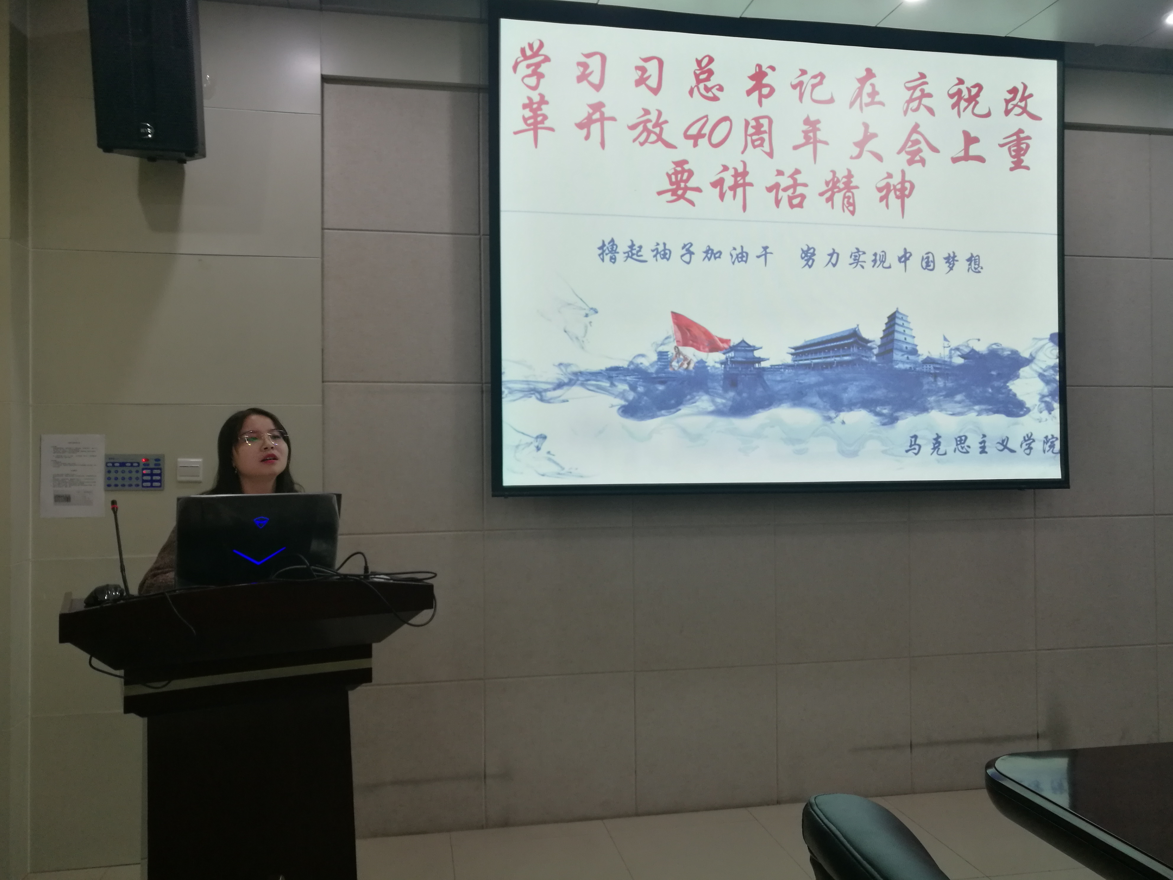 接下来,党建理论研习社的席丹同学以“学习习近平总书记在庆祝改革开放40周年大会上的重要讲话精神”为主题讲授了微党课。