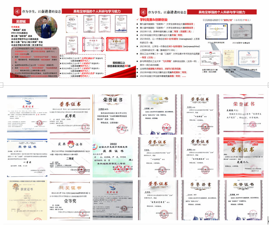 “飞天创客”双创空间。获得各级表彰荣誉近40项,包括五四红旗标兵、西北工业大学优秀学生党员、西北工业大学十佳班长等。作为班长,他带领班级以全校第一的评分,荣获“模范班级”荣誉称号。个人及团队事迹获得包括人民网、西北工业大学官网等各级媒体报道近40篇。