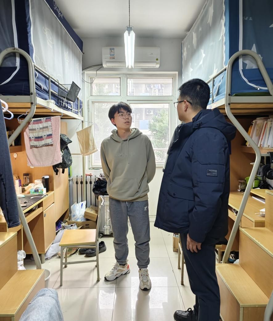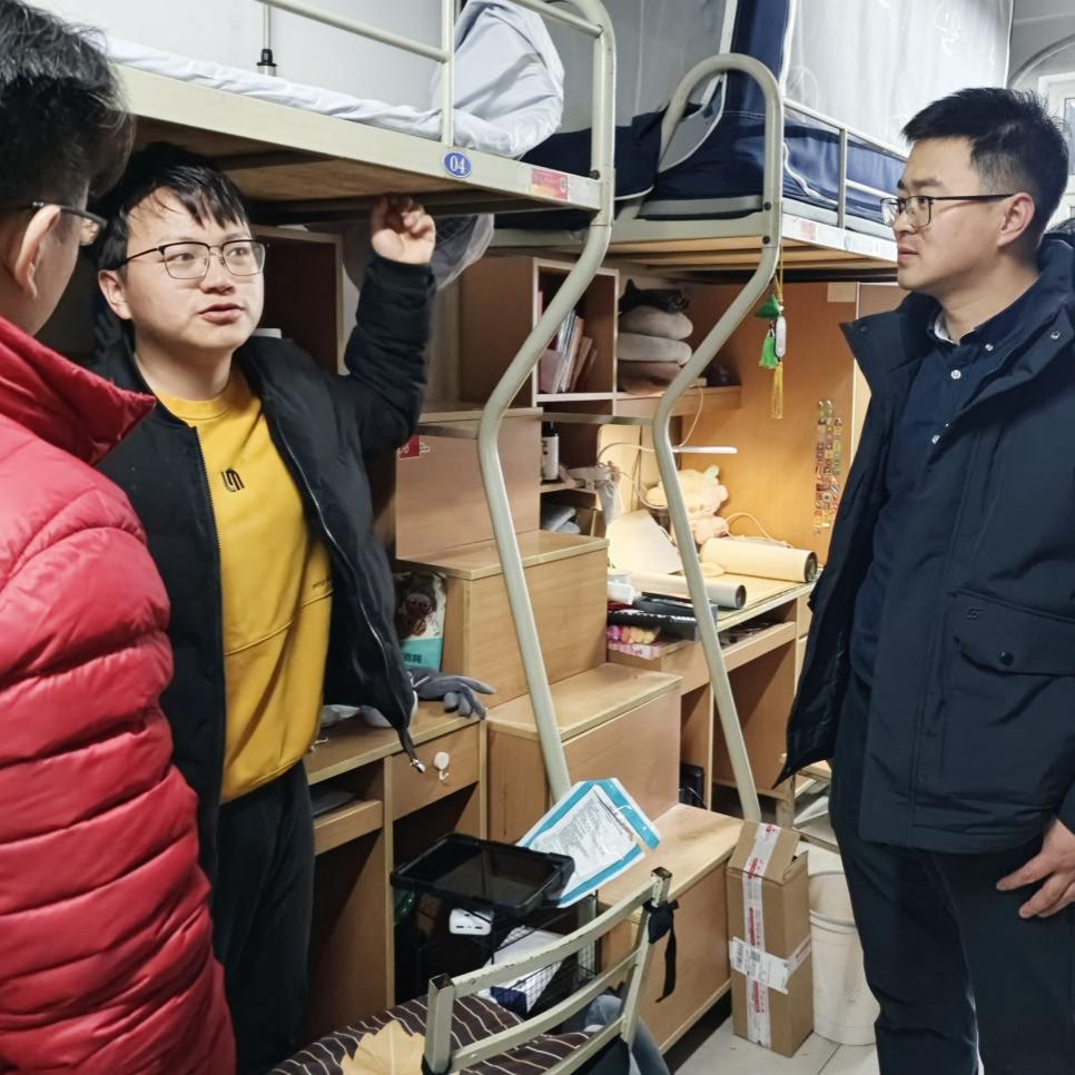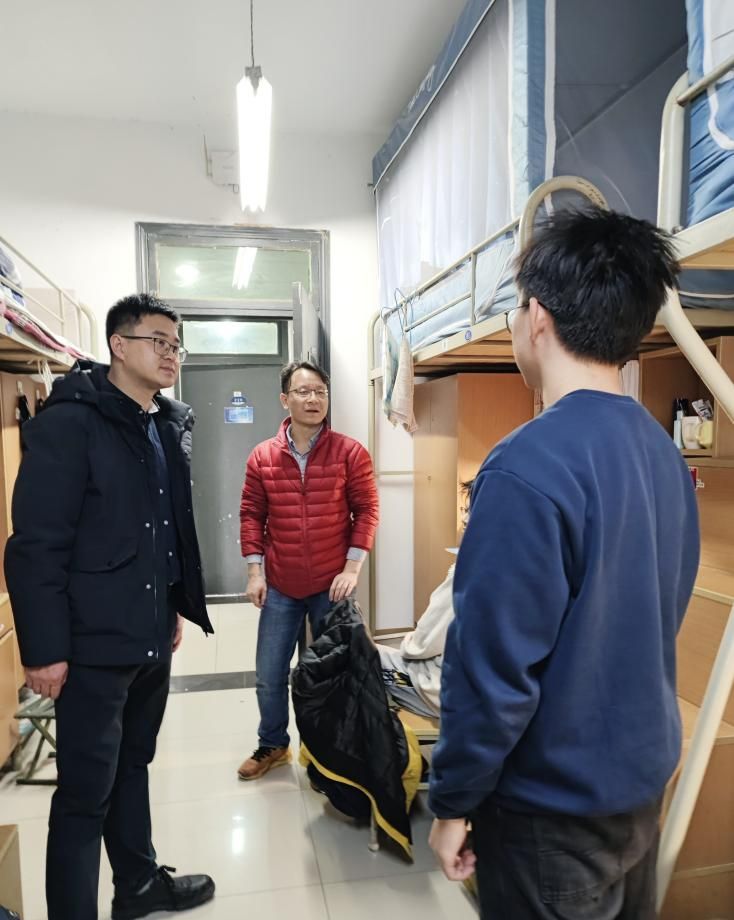 党委副书记易正阳走访宿舍过程中,重点对宿舍卫生状况、用电安全、返校情况等进行全面检查,对存在问题的宿舍提出明确整改要求;与大四学生深入交流,了解大家思想动态、考研情况、职业规划等,解答大家在学习生活中遇到的困惑,鼓励同学们把握机遇,明确职业规划,认真准备考研复试,积极参加招聘会,力争上大舞台、上主战场。
