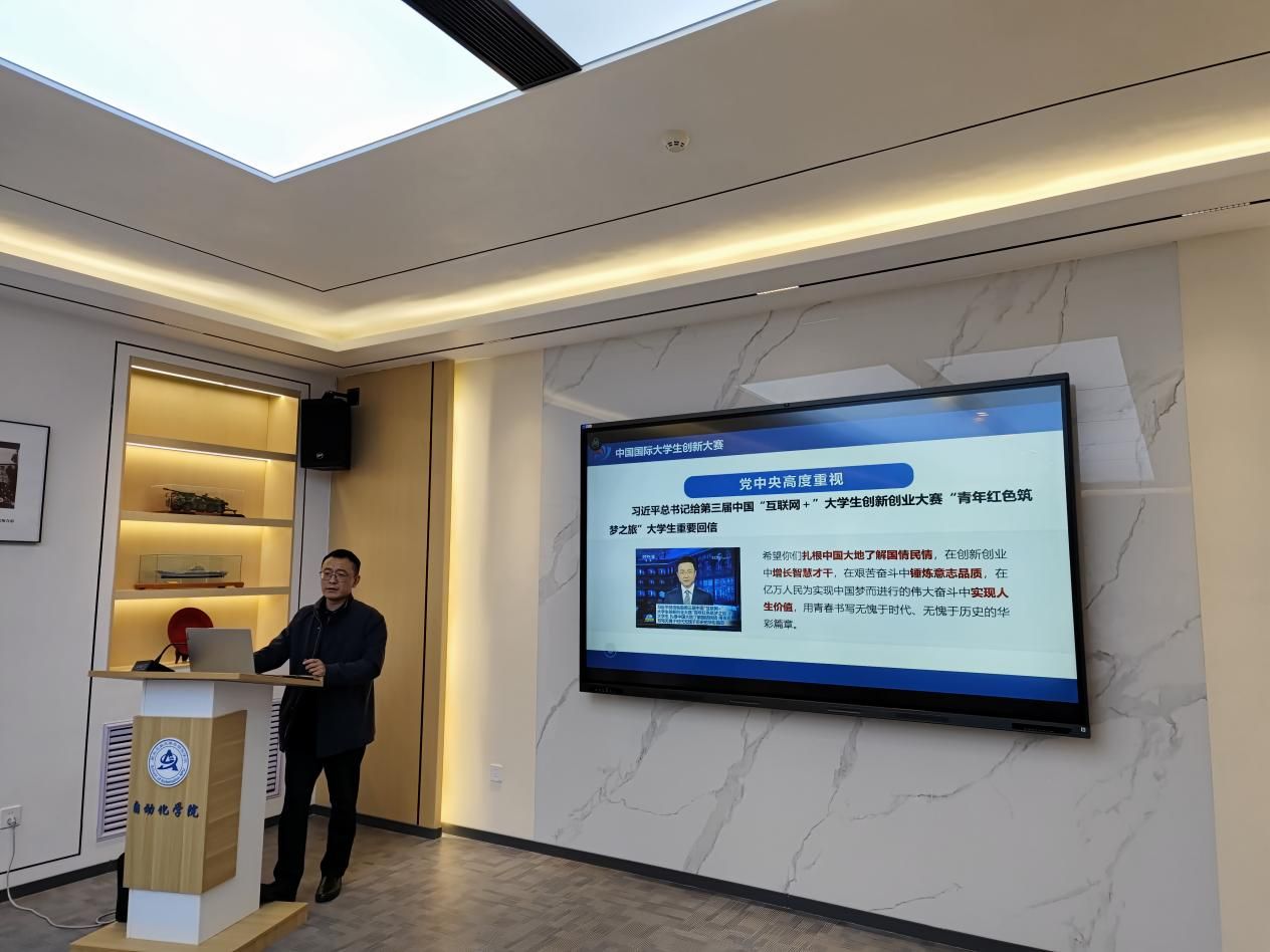 会上,贺华首先和大家共同学习了习近平总书记给第三届“互联网+”大学生创新创业大赛“青年红色筑梦之旅”大学生的重要回信精神,帮助大家全面理解举办中国国际大学生创新大赛的重要意义;并结合自身经历和实际案例,聚焦项目申报组织,就赛道设置、赛程安排、评审要点、项目优化等关键内容进行了详细的指导。贺华指出要深入了解项目的产业需求和市场形式,充分体现解决复杂问题的综合能力,通过创新创业大赛帮助学生增长智慧才干、锤炼意志品质、实现人生价值。