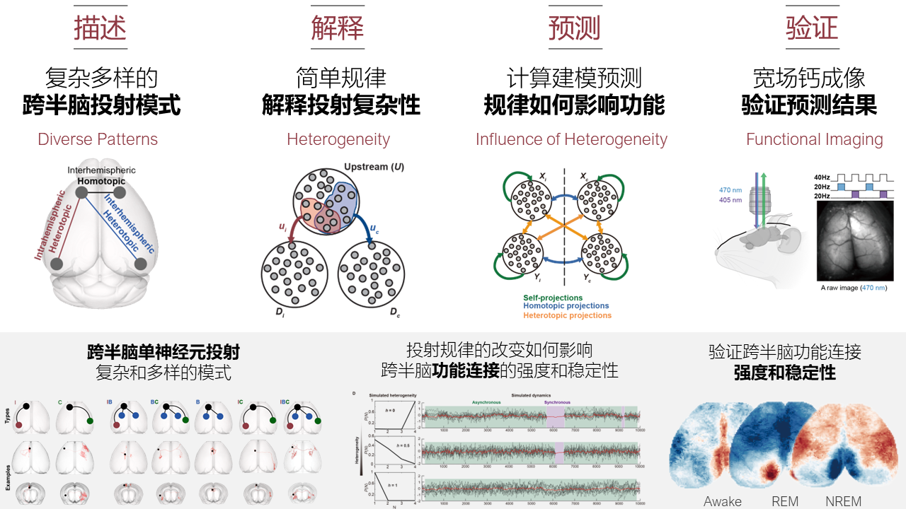 为了突破这些局限性,研究团队利用公开的Allen bulk示踪数据和单神经元示踪数据,创新性地探索了小鼠在群体水平及单细胞水平下特定区域、特定层和特定细胞的跨半脑结构连接模式。相比群体水平只能得到两种双侧投射模式,单神经元数据确定了五种双侧投射模式,进一步揭示了结构连接的复杂性。同时,研究团队在单神经元结构连接数据中定义了投射的“异质性”的概念,实现了对连接模式复杂性的量化。最后,研究通过多脑区神经元网络的动力学模拟和小鼠背侧皮层的宽场钙成像数据验证了异质性这一神经网络的结构属性对于神经活动存在重要影响,即半球间的异源投射表现出功能连接强度较低但条件稳定性较高的特点。