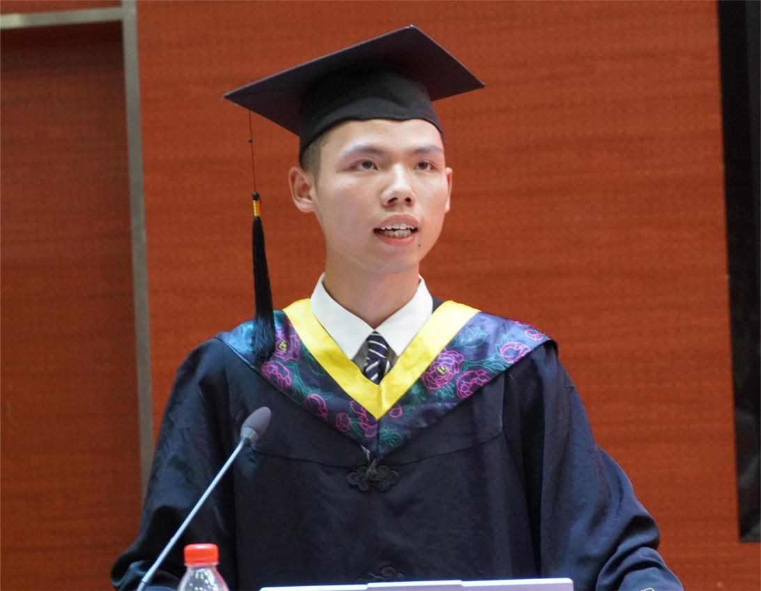 毕业生代表吴朋铖代表全体毕业生向精心栽培大家的母校及老师表示衷心的感谢。未来,他将以“功成不必在我,功成必定有我”的责任与担当,与国家紧密相连,与时代同频共振,用奋斗的“青春之我”诠释着爱党之心、报国之魂。