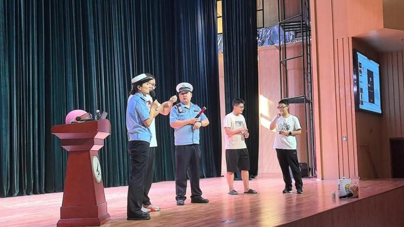 随后,小雁塔中队民警通过互动环节向同学们生动展示了交通安全的重要性。他们邀请同学上台参与模拟演练,以趣味的方式提醒大家遵守交通规则、注意出行安全。