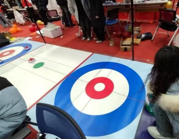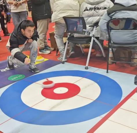 在活动区里,还有一场场别开生面的陆地冰壶比赛正在进行,同学们兴致勃勃地体验这项新颖的运动,每个精彩投掷都赢得现场阵阵掌声。
