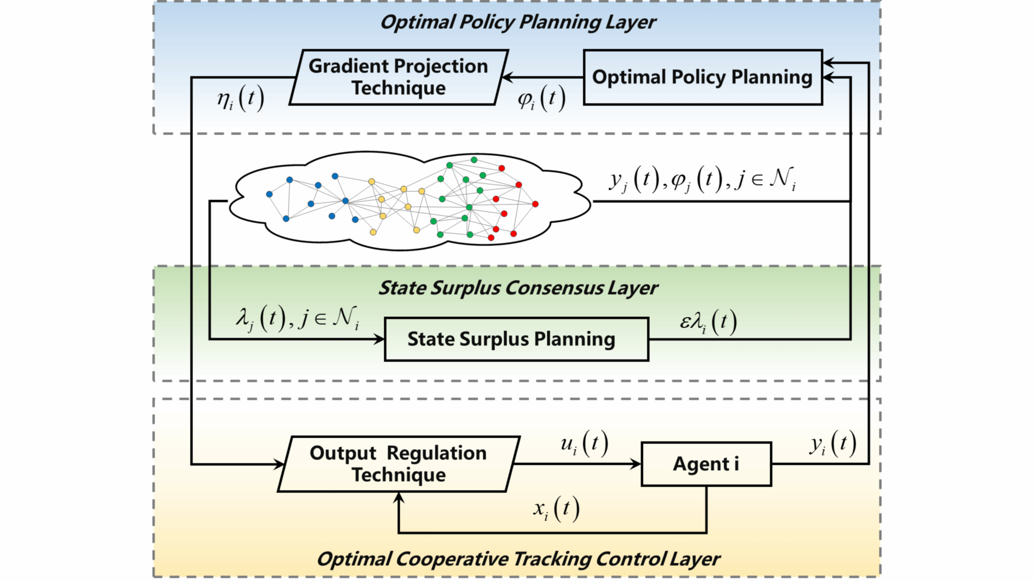 团队首先针对无约束的分布最优协同问题,巧妙利用输出调节技术和基于“盈余变量”方法,提出了一种独特的“决策控制一体化”分布最优协同算法,该算法由输出调节跟踪控制器和基于盈余调节的最优策略生成器组成。而对于具有网络资源约束和局部可行集约束的分布式约束最优协同问题,团队设计了基于梯度投影的分布式最优协同算法。这两种算法的提出,为解决多异构集群最优协同决策控制的复杂问题提供了全新的思路和方法。