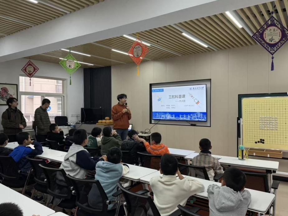 志愿者龙睿骞、罗啸天、王佳杰、牛超文于近期再次走进社区,带来了以“三航科普课——我的第一枚太空火箭”为主题的又一堂科普课。本次课程以“科普讲解+趣味手工”为主要形式,通过生动的课堂讲授与互动体验,让小朋友们在轻松愉快的氛围中了解航天知识。