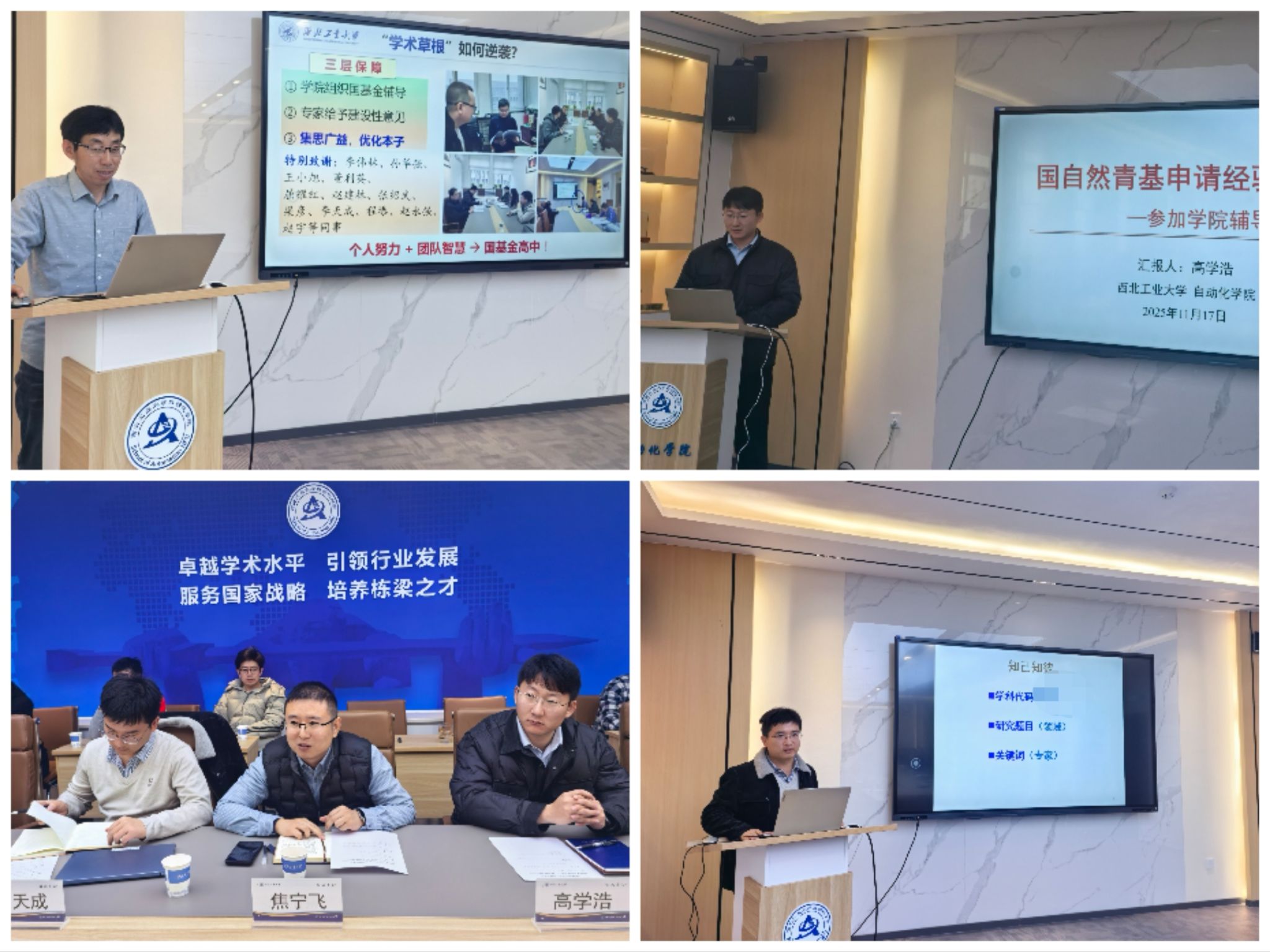 在经验交流环节,2025年获批项目教师代表李天成、焦宁飞、冯斌和高学浩结合自身经验,围绕申报书撰写技巧与项目申报经验展开分享。李天成依托其主持青B项目、面上项目及叶企孙联合基金重点项目的复合经验,系统分析了多类型项目申报书的结构性差异与共性规范,重点阐释了从选题创新性到技术路线的逻辑闭环构建策略。焦宁飞结合个人两次获批面上项目经验,通过申报者与评审专家的双重视角对比,提炼出申报书撰写避坑指南。冯斌深度复盘其面上项目多次申报历程,以个人申报书各模块的实证,展示如何运用多轮同行评议提升申报书质量,特别分享了通过广泛听取各类同行修改建议,多次打磨申报书获取的宝贵经验。高学浩特别致谢博彩网站导航