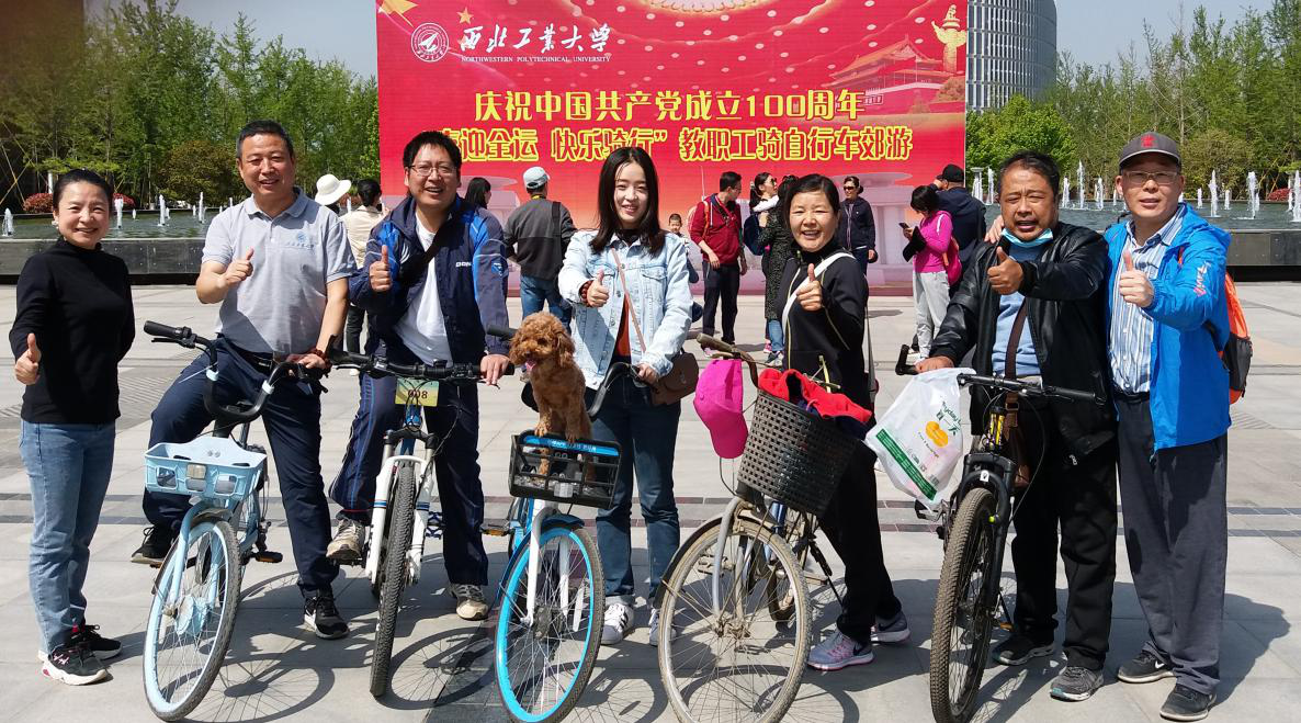教职工参加庆祝中国共产党成立100周年骑自行车郊游活动。