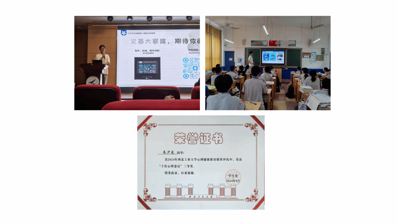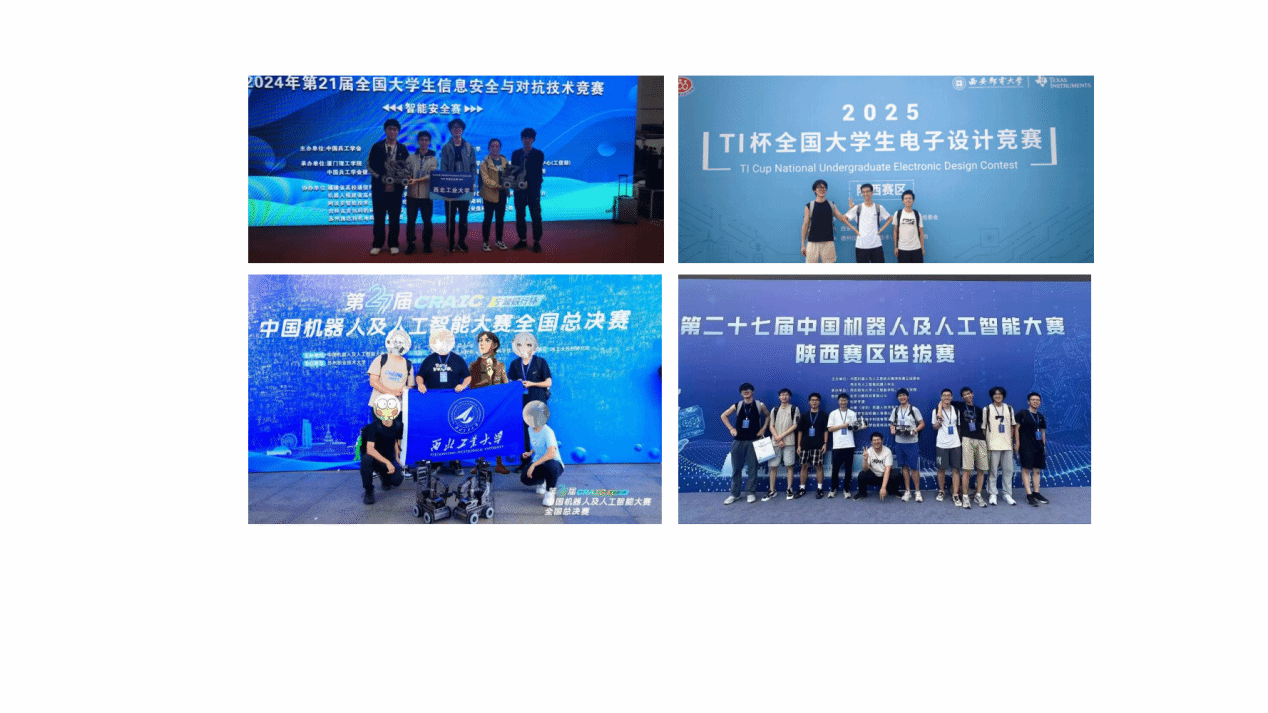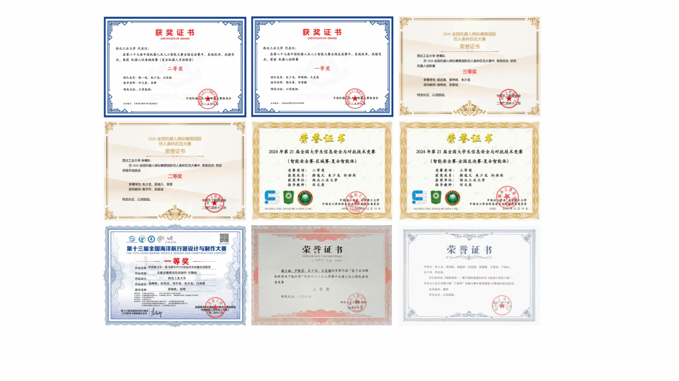 此后的两年里,朱少龙与队友几乎把“在路上”当成常态:他们奔赴西安、苏州、厦门、北京、镇江,在不同高校的赛场上连续鏖战,用一场场工程落地与临场协同,兑现“以赛促学、以研促创”的承诺。收获同样厚实——在国家级、行业级赛事中多点开花:第十三届海洋航行器设计与制作大赛一等奖;中国机器人及人工智能大赛总决赛(机器人创新赛)一等奖、(复合智能体赛)二等奖;全国机器人锦标赛暨国际仿人奥林匹克大赛(吞噬天地挑战赛)二等奖、(机器人创新赛)三等奖;中国机器人大会暨RoboCup机器人世界杯三等奖;第21届全国大学生信息安全与对抗技术竞赛三等奖;全国三维数字化创新设计大赛陕西赛二等奖;第23届“三航杯”创新大赛二等奖等奖项。一次次上场,是对方案论证、结构设计、调试联调与赛场执行力的全链路检验,也是他将“想法—原型—作品—成绩”闭环打磨的最好注脚。