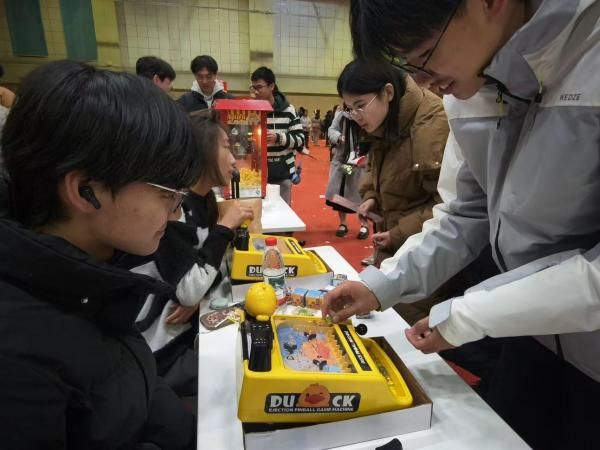 与云天苑餐厅的温馨相映成趣,翱翔体育馆副馆的元旦嘉年华活动现场同样热闹非凡。投壶、丢沙包、套圈等经典传统游戏区域前,同学们排起了长队,摩拳擦掌,跃跃欲试;弹珠机清脆的碰撞声此起彼伏,为新年增添了轻松欢快的气息。