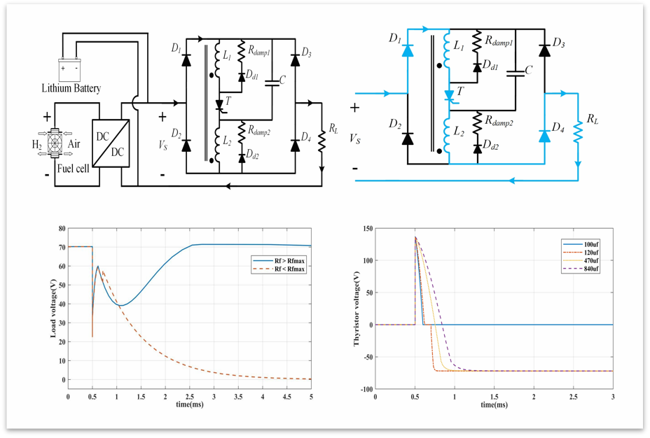 张博文的论文针对燃料电池系统中能量双向流动及保护的需求,提出了一种应用于质子交换膜燃料电池电动汽车系统的新型Z源双向直流固态断路器。二极管整流桥结构的应用使断路器具有双向功率流的能力,简化了电路结构,减少了元件数量。变压器绕组的使用解决了阶跃负载引起的误触发问题,提高了系统的可靠性和安全性。与传统Z源断路器相比,本文提出的新型双向断路器具有结构简单、体积轻、元件少、不易误触发等优点。通过仿真分析验证了该新型拓扑有效地实现了能量的双向流动和短路故障的双向隔离。相关结果如图所示。