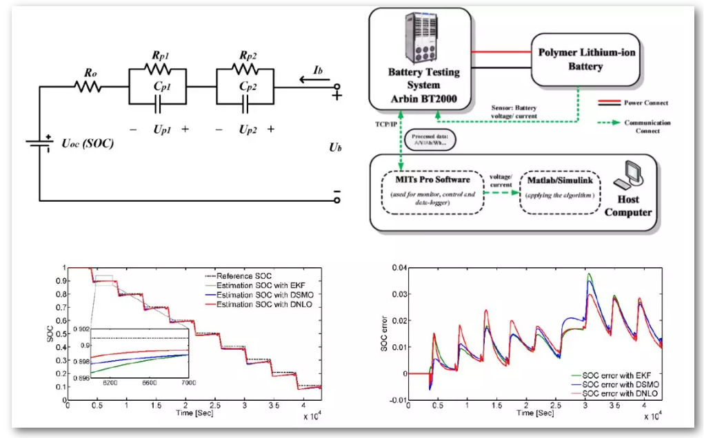 梁李柳园的论文,建立了锂离子电池的二阶RC等效电路模型,利用指数拟合法辨识出电池模型中的离线参数。基于所建立的二阶RC等效电路模型,论文提出了一种利用离散非线性观测器对锂离子电池SOC进行估计的新方法,并用李雅普诺夫稳定性理论对该观测器的收敛性和稳定性进行了论证。最后基于HPPC测试实验验证了该方法的性能,实验结果表明,相比于扩展卡尔曼滤波算法和离散滑模观测器算法,该观测器算法在降低计算损耗、提高模型精度、加快收敛速度方面具有更好的性能。此外,该方法对电流噪声干扰具有良好的鲁棒性。相关结果如下图所示。