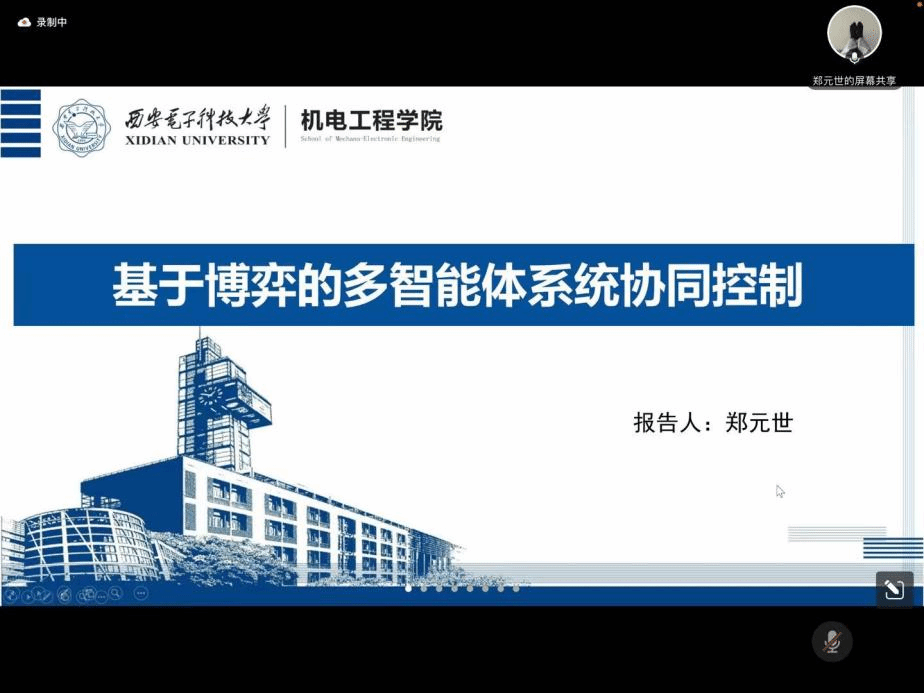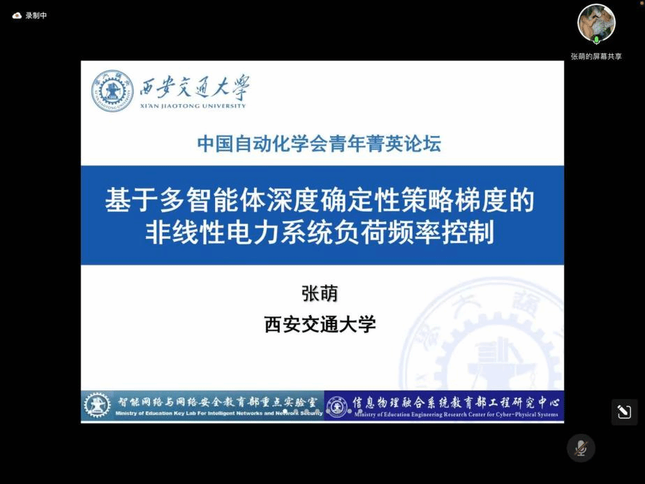 来自西北地区七位知名学者和企业专家做论坛专题报告,介绍了信息物理系统领域目前最新研究进展及需要解决的问题。西北工业大学的王震教授做了题为“AI驱动的网络空间智能对抗”的学术报告,西北工业大学的李慧平教授做了题为“海洋航行器模型预测控制”的学术报告,西安电子科技大学的郑元世教授做了题为“基于博弈的多智能体系统协同控制”的学术报告,国网青海省电力公司清洁能源发展研究院新能源产业发展研究中心的杨立滨副主任做了题为“基于电池储能的新能源送端电网暂态能量控制及储能优化方法研究”的学术报告,西安交通大学的张萌副教授做了题为“基于多智能体深度确定性策略梯度的非线性电力系统频率控制”的学术报告,国网陕西省电力有限公司电力科学研究院电源技术中心的王若谷副主任做了题为“含高比例新能源的电力系统优化运行与控制技术研究”的学术报告,新疆大学的于志永副教授做了题为“几类多智能体系统一致性及分布式优化控制方法”的学术报告。