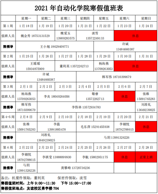 安排,值班时间为周一到周五9:00~11:30和15:00~17:00,值班地点友谊校区勇字楼公共办公区704,值班日期、人员附后。
