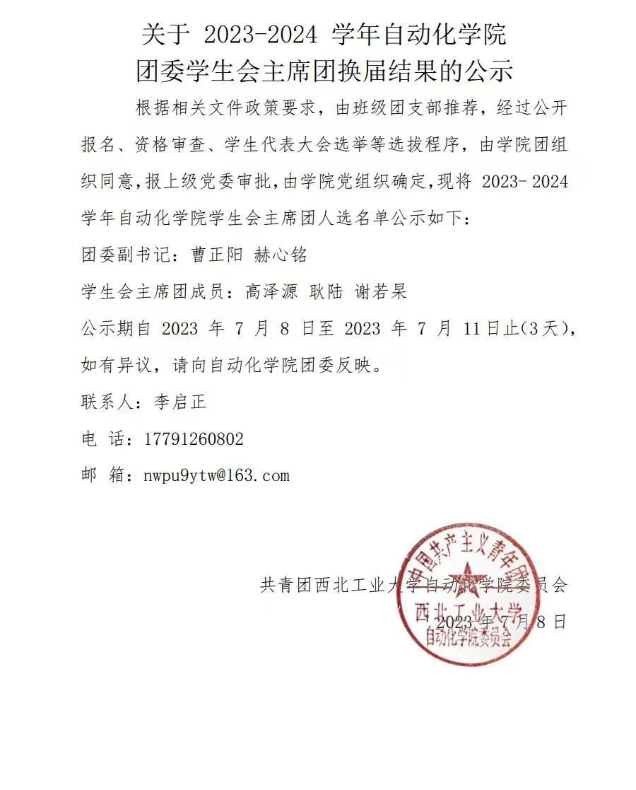 根据相关文件政策要求,由班级团支部推荐,经过公开报名、资格审查、学生代表大会选举等选拔程序,由博彩网站导航 团委组织同意,报上级党委审批,由博彩网站导航 党组织确定,现将 2023- 2024 学年博彩网站导航 学生会主席团人选名单公示如下: