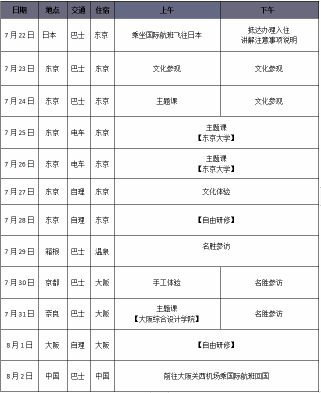 【费用包含】日本当地的课程费、海外保险费、交流期间住宿费、机场接送费、所列巴士交通费、所列景区门票和文化学习及体验活动费用;