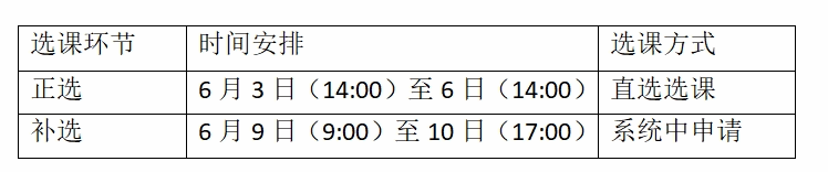 此次选课分为正选和补选。正选于6月3日14:00开始,6月6日14:00结束,选课方式为直选选课。补选于6月9日9:00开始,6月10日17:00结束,选课方式为在系统中申请。