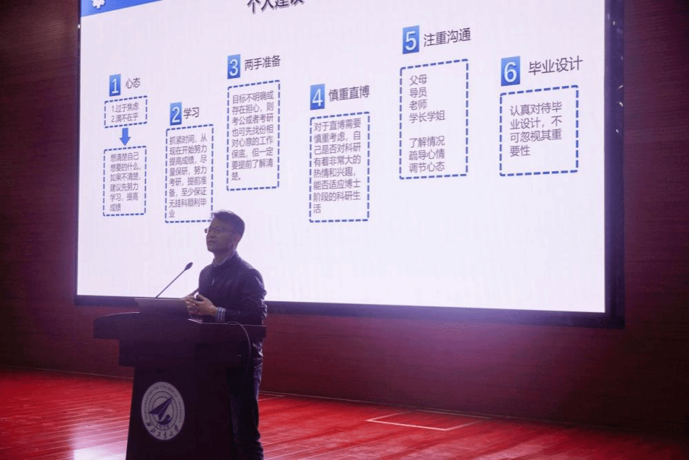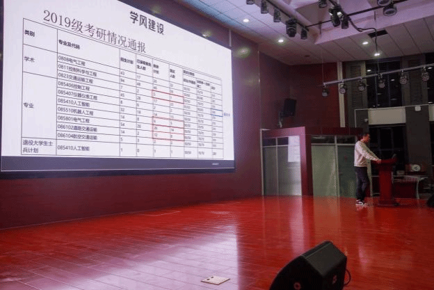 的保研政策,在对保研同学表达祝贺的同时,也为准备考研的同学们加油打气,希望同学们艰苦奋斗、充满自信地迎接即将到来的挑战。随后,周杨为同学们分析了19级同学的考研情况,并帮助他们答疑解惑,减轻压力。余孝军为同学们提出了很多关于考研的个人建议,包括心态、学习、考前准备、沟通交流、毕业设计等多个方面的内容,帮助同学们扫除前进路上的绊脚石。