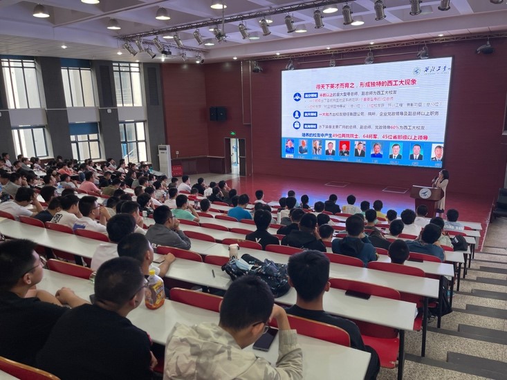 党委副书记马玥就西工大精神、西工大现象等内容开展了一堂生动的思政课,鼓励广大新生要以中国工程院院士陈士橹、歼-20总师杨伟,龙湖地产吴亚军等优秀校友为榜样,敢为人先,心怀“国之大者”,做到察国之大事、悟国之大局,与国家同命运共发展,为祖国的国防科技事业贡献力量。