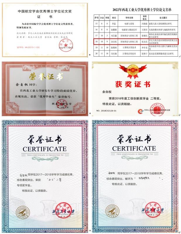 求索路途,勇毅前行。博士期间,聚焦集群无人机容错协同控制领域中的关键技术难题,他勤于思考,善于创新。在科研道路上,灵感迸发瞬间的背后,是长时间的积累与思考,遇到科研难题他毫不畏惧,坚定信念,敢于向未知领域的前沿技术发起挑战。在一次又一次的磨练中,他始终秉承母校西北工业大学“公诚勇毅”校训,不断践行科创使命,最终取得了较为丰硕的研究成果,荣获多项奖励表彰。